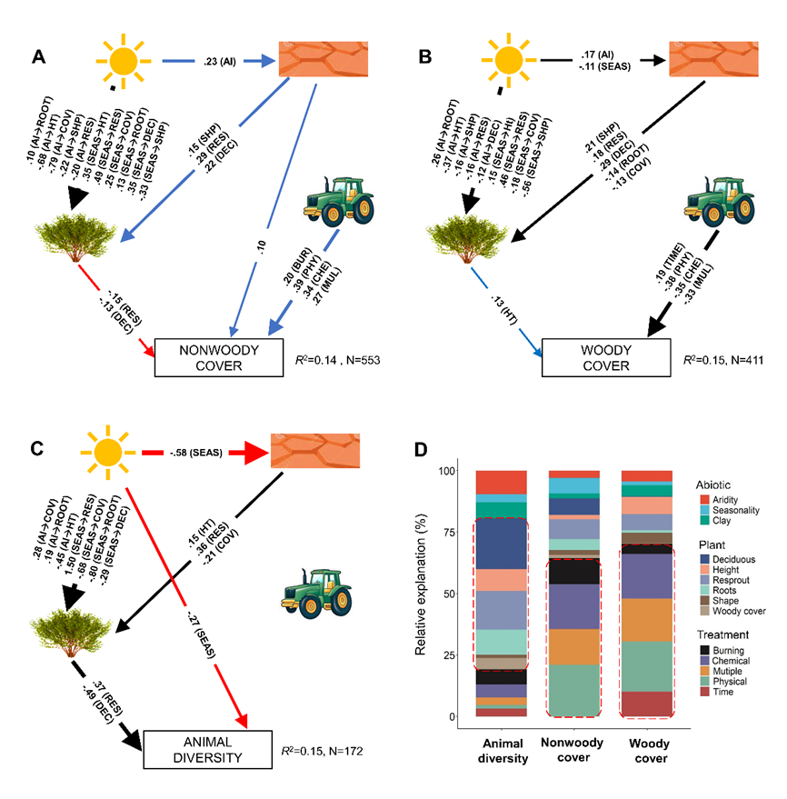 图2 驱动因子(气候、土壤、灌丛化性质和移除管理)对灌木移除效果(A草本植物盖度,B灌木盖度,C动物多样性)的影响,(D)基于每个驱动因子的标准总效应所计算的相对解释率占比