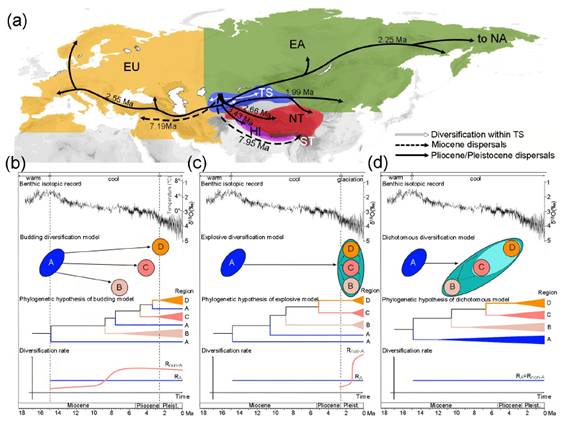 研究发现,湖泊钩虾起源于天山, 高山湖泊是冷水性钩虾全球迁移扩展的通道,更新世气候变冷形成大量的高山湖泊或冰川湖,驱动钩虾多次从天山拓殖到全球高山湖泊以及环北寒带冰川湖泊中,该研究定义这种分化方式为“出芽式分化”(budding diversification);同时发现未来气候变暖将导致钩虾局限在更高海拔更高纬度,造成土著遗传多样性降低。这些研究结果揭示天山及其周边地区是冷水性生物的起源地和新物种形成的热点地区,为开展生物多样性调查和预测气候变化背景下喜冷生物的响应机制提供了理论依据。
