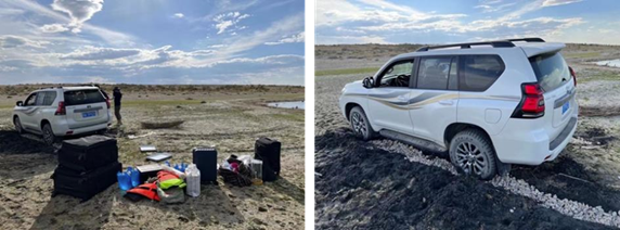 此次科考的路途中队员们也遇到了一些小插曲。在少有人烟的乌伦古湖湖畔,采样车一侧陷入了淤泥之中无法行进。队员们先是卸下车上所有负重,然后徒手挖开车轮边的湿泥,又从附近运来碎石铺成了一条相对硬实的小路,花了三个多小时终于脱困。