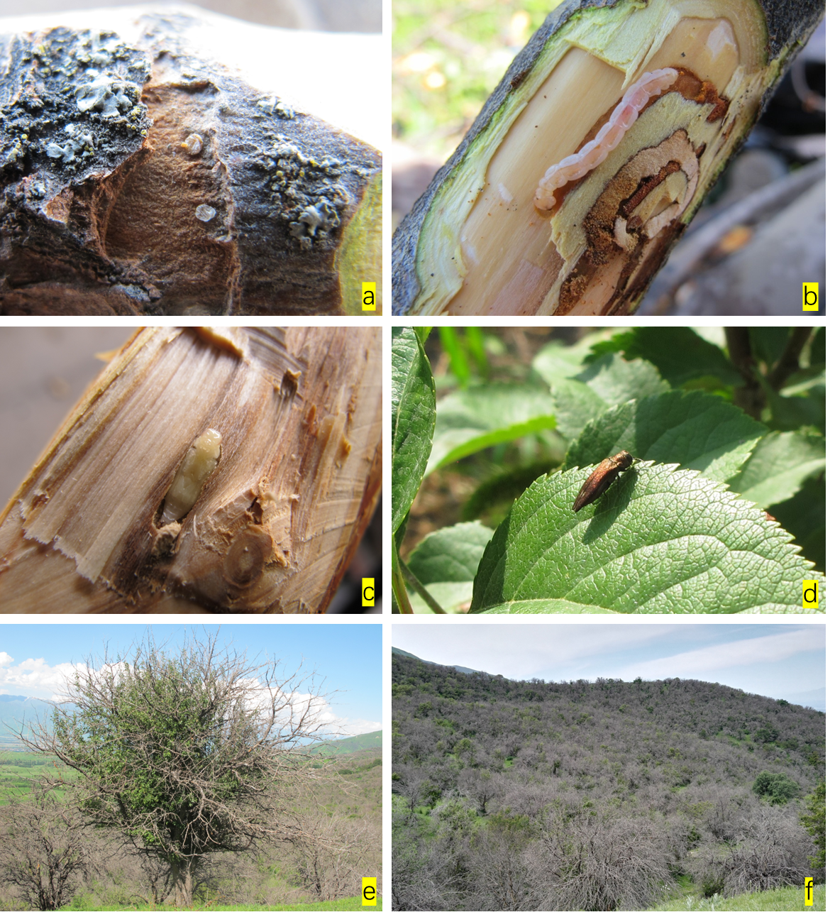 (a.苹小吉丁卵,b.幼虫,c蛹,d.成虫,e.新疆野苹果单株受害状,f.新疆野苹果成片受害状,照片拍摄人:张彦龙)