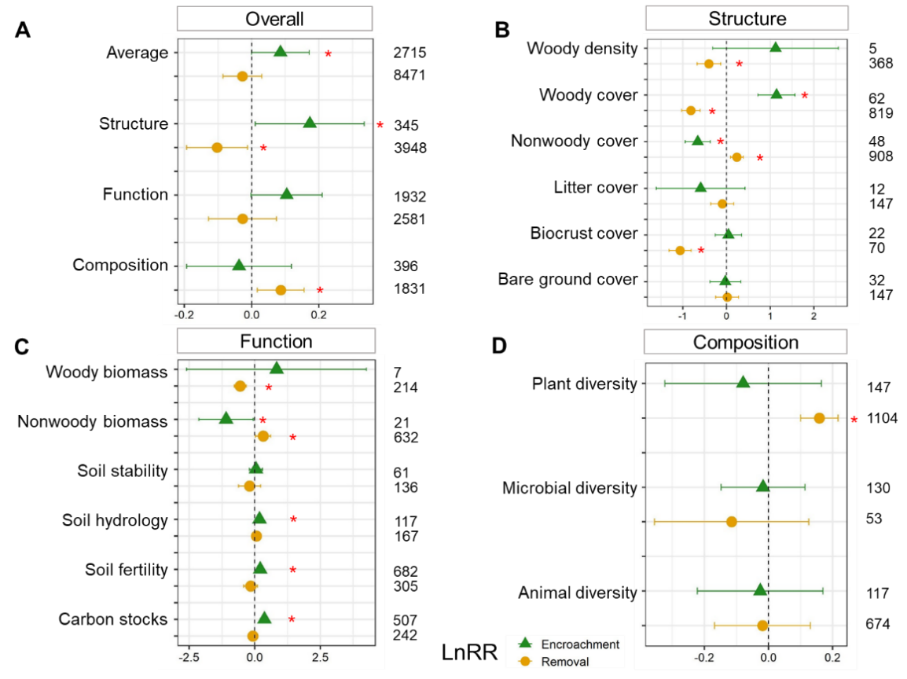 研究结果发现,灌木移除措施总体上无法逆转草地灌丛化所带来的影响(图1A)。对于牧民普遍关心的草本盖度,灌木移除仅能逆转<50%的草地灌丛化影响。例如灌丛化导致草本植物盖度下降了48%,但是灌木移除仅能提高21%的草本植物盖度(图1B)。与以往认为灌丛化是生态系统退化反映的普遍观点相反,该研究发现灌丛化能够提高生态系统8%的总体功能,具体体现在生态系统功能的增加上(图1C),如灌丛化能够增加31%的碳固定、18%的土壤肥力和17%的水文功能,灌丛化能够显著增加植物多样性(图1D),而灌木移除整体上对生态系统功能的影响并不显著,说明灌木移除并非是一种能够有效提高灌丛化生态系统功能的管理措施。