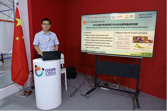 为响应和宣传中国政府在应对气候变化挑战方面的政策和行动,第三次新疆科考项目“天山北坡水资源承载力与水安全要素基础性调查”牵头单位中国科学院地理科学与资源研究所派出代表参加了在埃及沙姆沙伊赫举办《联合国气候变化框架公约》第27次缔约方会议(COP27),并于11月6日在中国代表团搭建的“中国角”宣讲了科考项目取得的成果。