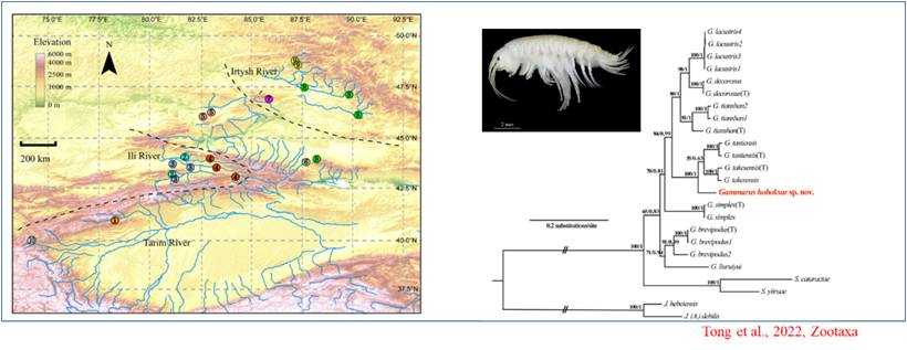 额尔齐斯河流域生态系统与生物多样性调查项目组在额尔齐斯河流域发现了特有钩虾新物种,并绘制了钩虾物种分布现状图(1:25万)。通过与全球3180种钩虾遗传和分布数据对比分析,证明天山及其周边地区是世界冷水性生物起源地。