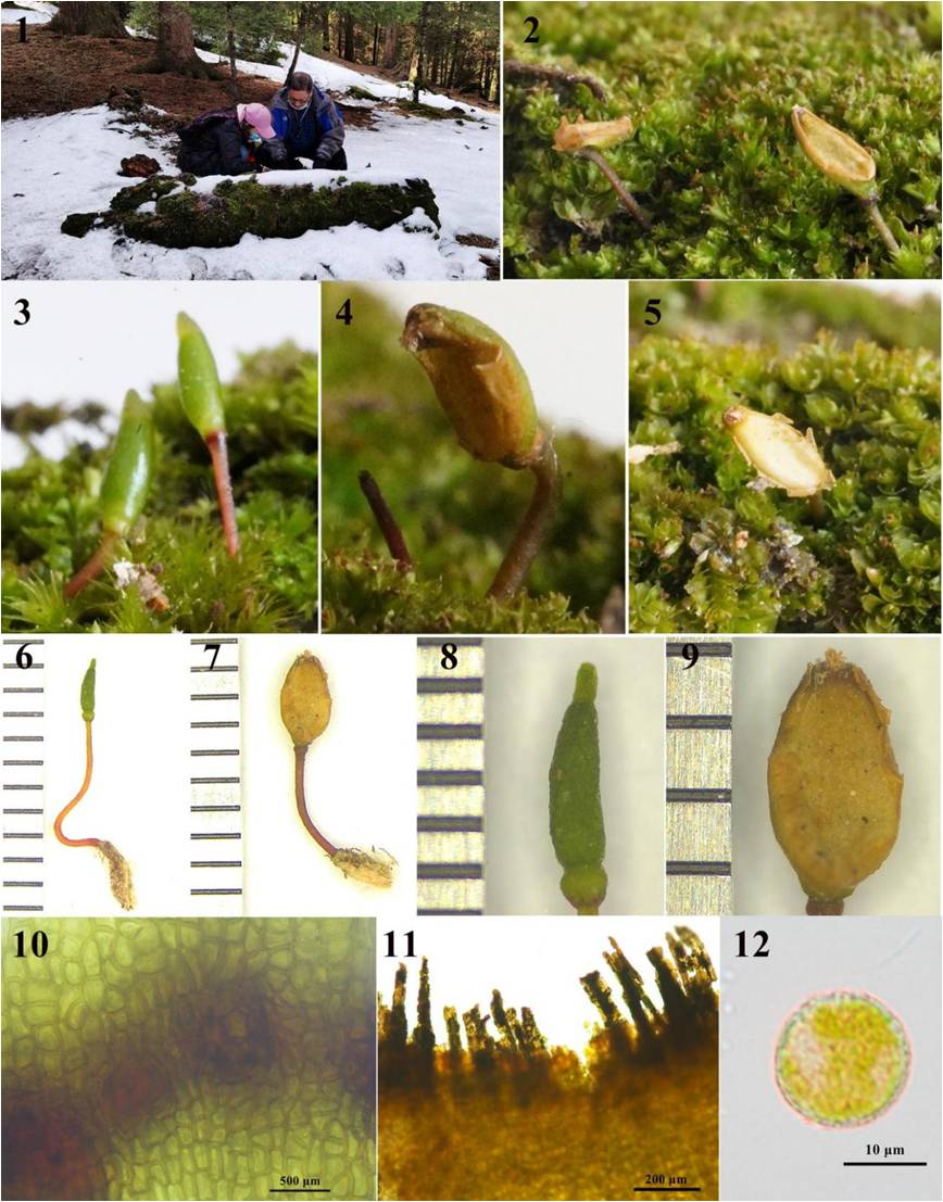 1:生境;2-7:植物体;8-9:孢蒴;10:气孔;11:蒴齿;12:孢子