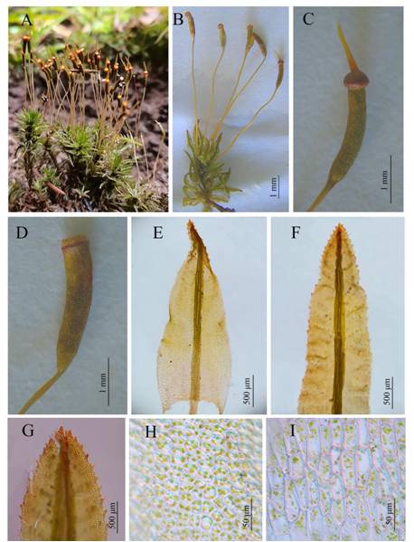 A-B 植物体;C-D 孢子体;E-F 叶;G 叶尖;H 叶中部细胞;I 叶基部细胞