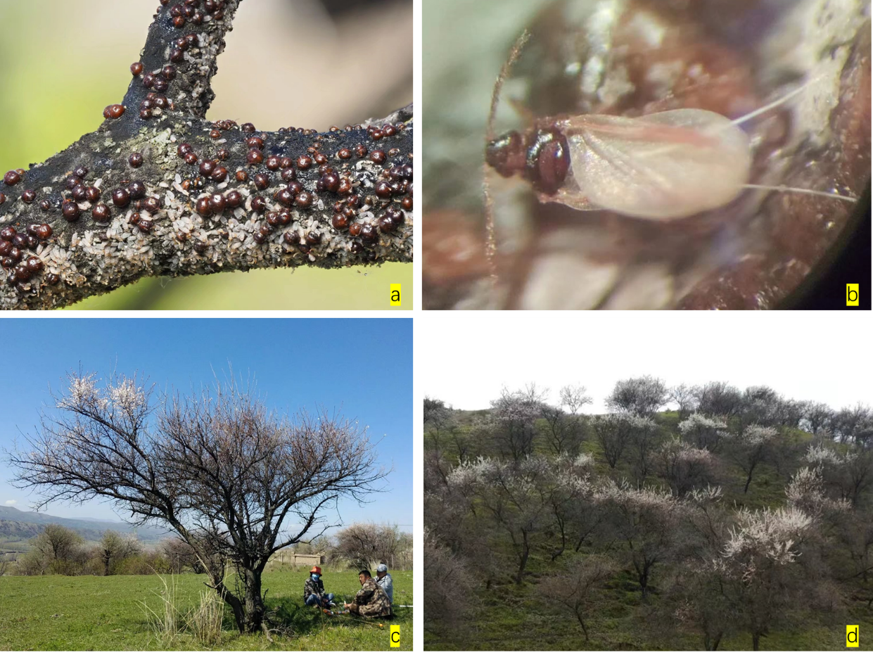 (a杏鬃球蚧雌虫,b.雄虫,c.单株新疆野杏受害后开花量减少,b.成片新疆野杏受害状,照片拍摄人:王玉丽)