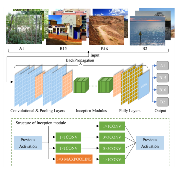 然后,构建基于Inception的自然场景图像识别模型(NSIC-Inception model),提高自然场景图像分类的效率和精度,模型结构如图2所示。利用NSIC-Inception模型基于全球范围的自然场景图像训练和学习,并与地表覆盖数据进行验证对比分析,具有优秀的泛化能力。